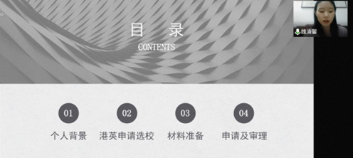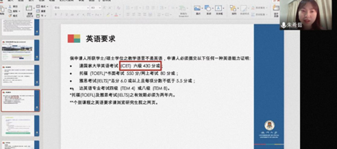 朱希茹和魏清馨同学分别结合自己申请澳门大学、香港中文大学硕士研究生的经历,向同学们分享了项目申请的的具体流程、材料要求和学术要求。其中,朱希茹同学据自己具体的学习生活经历,讲述了诸多关于学校课程设置、学费、奖学金等问题的细节;魏清馨同学据自己的升学经历,向我们展现了诸多的申请方法和相关的具体事项。二位同学的分享为同学们打开了新的思路,给同学们提供了有益的参考。