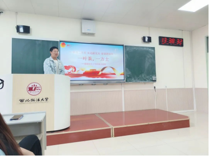 2022级陈财位同学讲述题为《一叶茶,一方土——看新时代十年的伟大变革》的主题团课。他以小见大,从一个凭种茶脱贫致富的小村子讲起,引申到新时代中国社会各方面所取得的伟大成就和历史性变革。